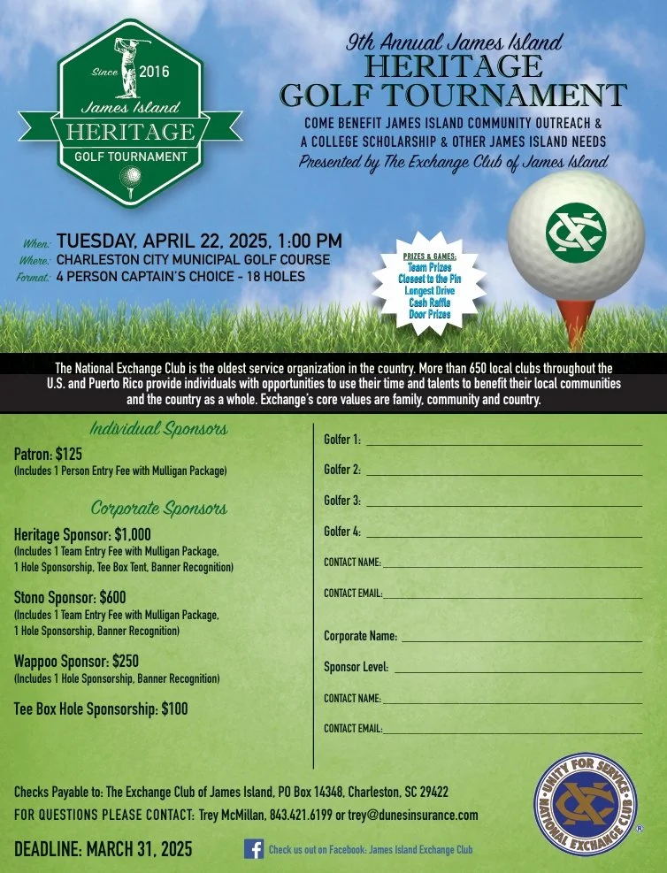 Excited to announce that the 9th Annual James Island Heritage Golf Tournament presented by the Exchange Club of James Island is coming up soon! A day of great golf, amazing community, and in support of James Island Outreach and other needs within the community! All for a great cause!